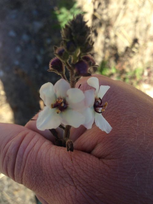 Moth mullein is a biennial, and occasionally annual or short-lived perennial, forb in the Scrophulariaceae (figwort) family. It grows from a taproot to form a basal rosette in its first year of growth; in the second year of growth, it produces a single stem that may reach up to 5 feet tall. Leaves are dark green in color and only sparsely hairy. Leaves are oblong to oblanceolate and up to 8 inches long. Rosette leaves are toothed on the margins and have prominent veins. Leaves are alternate and decrease in size up the plant. Moth mullein flowers on spike-like racemes from mid-spring to late summer. Flowers are formed on small stems off the raceme; they are about 1 inch wide and have 5 yellow or white petals and 5 stamens with red or purple hairs. Seeds are formed in capsules with many small, dark seeds in each capsule.