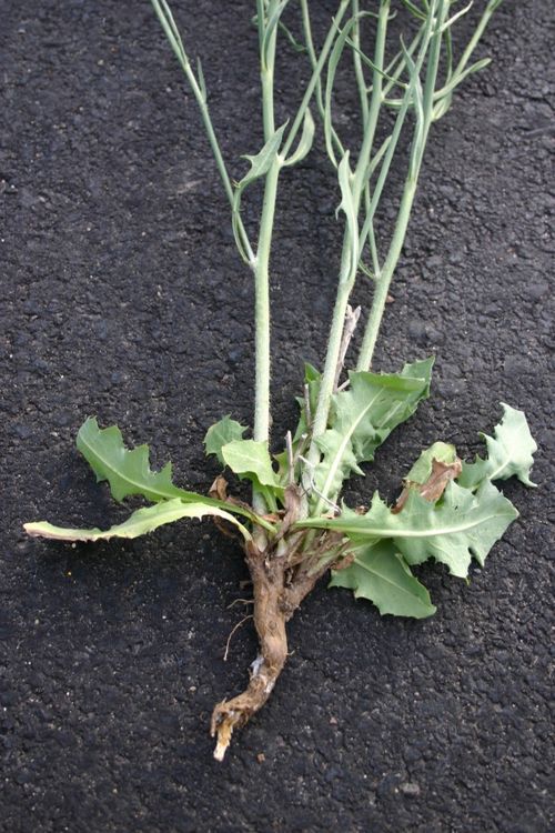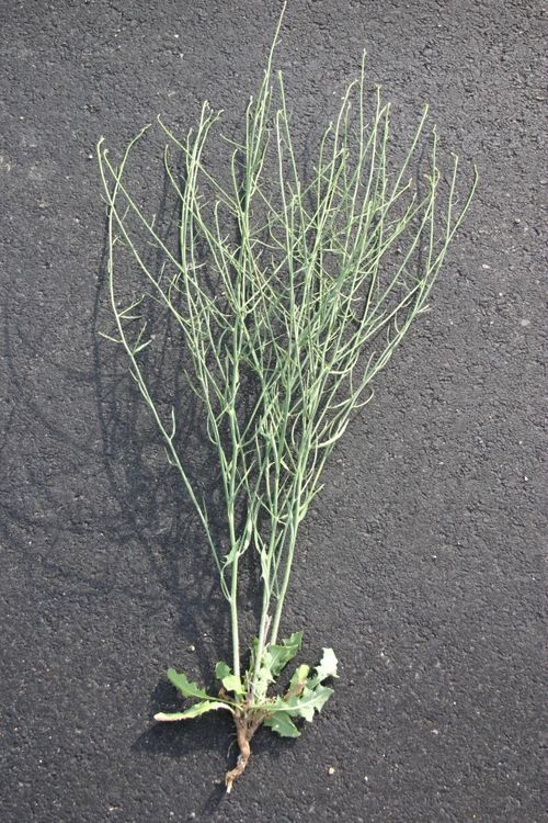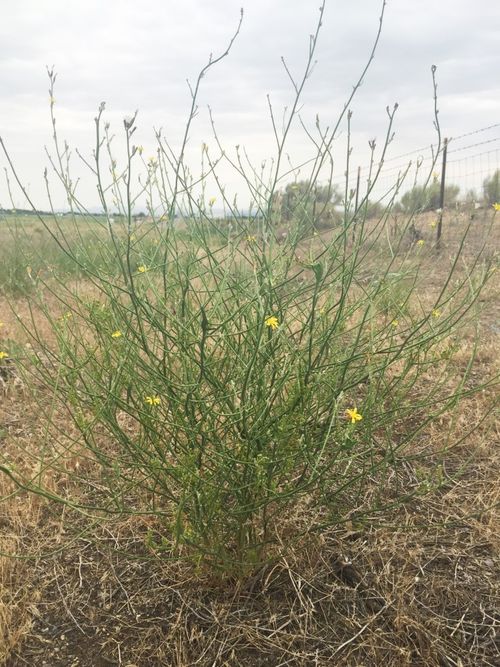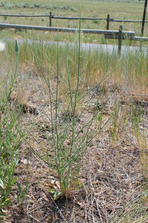 Herbaceous perennial, erect to 5 feet tall. Leaves: Basal rosettes leave - sharply toothed, lance-shaped (dandelion-like), lobes are angle back toward center of plant. Upper leaves - inconspicuous, narrow, smooth margins Stems: Bottom 4 to 6 inches has numerous, red, downward bent coarse hairs. stems smooth above. many branched Flowers: Yellow, 3/4 inch wide, scattered on branches. 7 to 15 strap-shaped petals are flat across the end terminating with distinct lobes or teeth Roots: Extensive and deep Reproduction: seeds: pale brown to black, 1/8 inch long, several ribbed, smooth below with tiny scale projections above, terminated by a long beak with numerous soft, white bristles for wind dispersal; vegetative: lateral shoots and shoot buds
