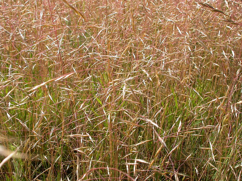 Ventenata is a winter annual grass in the Poaceae family. Seeds may germinate in early spring or late fall. It produces slender, 6 to 28 inch long stems. Stems and underside of leaves may have small hairs or may be glabrous. Leaves are narrow (1 to 3 mm wide) and 2 to 7 cm long. Leaf blades are usually flat at the base and rolled or folded toward the tips. Ligules are membranous and up to 1 cm long. Stem nodes are reddish-black to black and glabrous. Ventenata flowers from mid-spring to early summer. Inflorescences are wiry panicles that may be up to 8 inches long. These panicles are composed of clusters of spikelets containing 3 florets with at least one twisted awn. Seeds are formed in awns that are around ¾ to 1 inch long. Seeds are usually viable for 2 years. Ventenata has a shallow, fibrous root system.