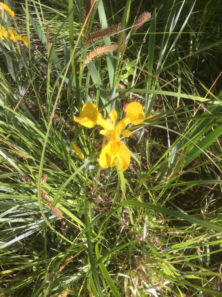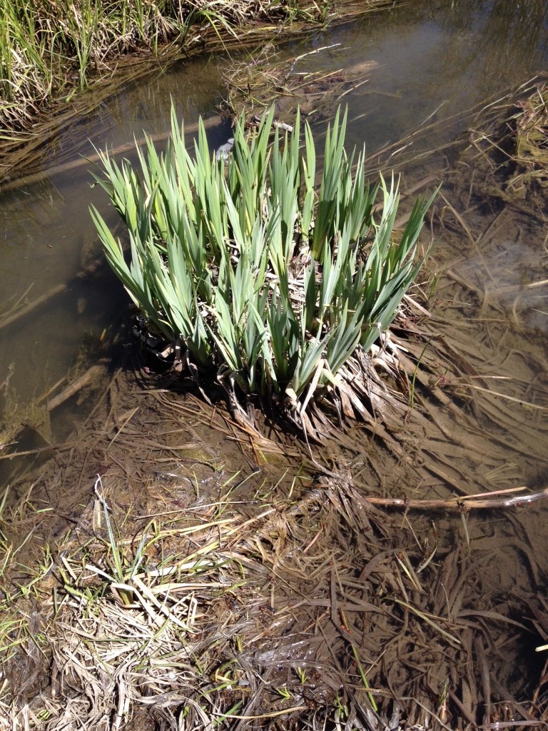 Aquatic perennial 3+ft. Erect along shorelines and stream banks, can survive on drier sites. Leaves: Basal leaves broad flat, sword-shaped. No stalks, Upper leaves smaller. Stems: Single branched. Flower: Yellow downward sepals with dark (purple) streaks, 2-4” across, few to several on stem. Roots: Fleshy rhizomatous. Reproduction: Seeds: Formed in 3 sided pods, each pod produces up to 30 flat brown seeds. Vegetative: Rhizomes fragments which break easily.