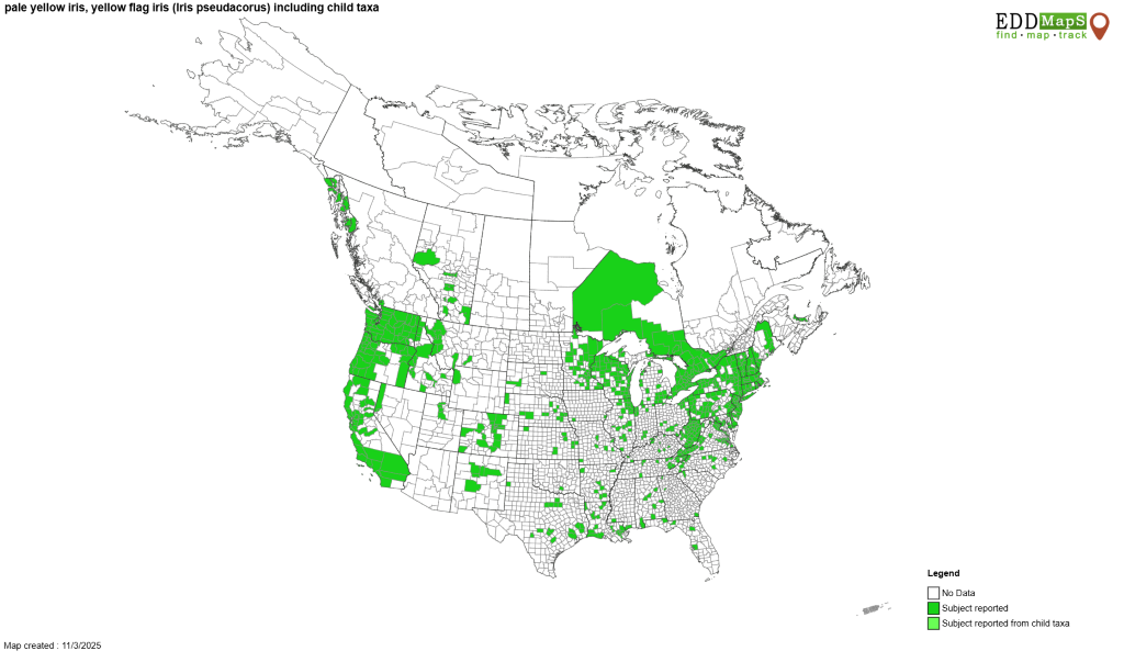 Native to Eurasia. Introduced to North America as an ornamental. In Teton County, yellowflag iris is found on ditches across the county. Some locations were intentionally introduced prior to the species being declared noxious. These locations were reported to TCWP by the landowners, and TCWP and these landowners work together to remove these plants and prevent further spread.